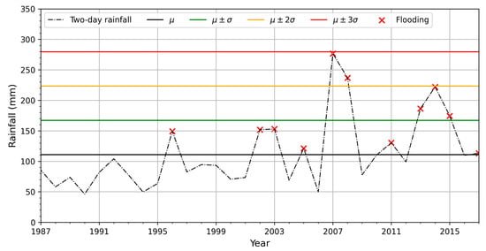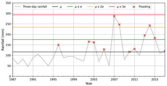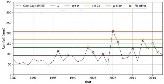 Annual maximum daily rainfall in Jakarta between 1987 and 2017. The maximum daily rainfall values that resulted in flooding are presented with a red cross. Here, µ and σ denote the standard deviation and the mean value of the annual maximum daily rainfall (Pm) time series during 1987–2017 for Jakarta, respectively.