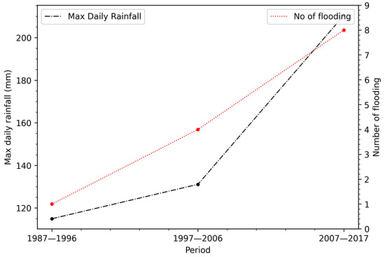 An increase in the number of flooding events between 1987 and 2017 in Jakarta has a relationship with an increase in daily rainfall, as depicted in Figure 10. The number of flooding events between 1987 and 1996 was one, which occurred when the maximum daily rainfall was about 114 mm. The number increased to four events between 1997 and 2006 when the maximum daily rainfall was about 131 mm. Afterwards, the number of flooding events between 2007 and 2017 also increased to eight when the maximum daily rainfall was about 210 mm, observed in 2007.