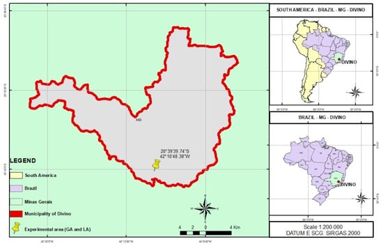 This research was carried out on the agricultural holdings of two families located in the municipality of Divino (−20.615981 latitude, −42.156477) longitude, situated in the state of Minas Gerais. The climate in this region is categorized as Cwa (Cwa: C = Mild temperate, w = Dry winter, a = Hot summer), as per the Köppen–Geiger classification system. The average annual temperature stands at 19.9 °C, accompanied by an average annual precipitation of 1282 mm, given the altitude of 950 m. The farming properties are in the Taquaraçu community and are referred to as GA (Gilvânia and Anacleto) and LA (Luís and Aparecida). The coffee plantations have been operating for about 12 years, but they have been using organic cultivation for the last five (Figure 1).