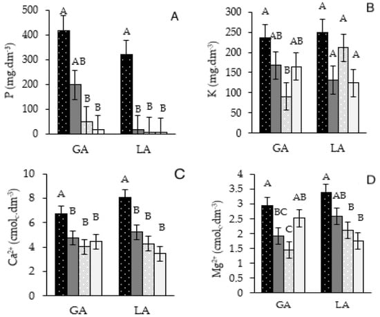 Microbial respiration in the soil was determined following the methodology adapted from Mendonça et al. [35], utilizing the incubation method for 21 days. The total CO2 produced was calculated by summing the values obtained in each sampling. The CO2 calculation (mg C g−1 soil) employed the following formula: CO2 = (B − V) × M × (V1/V2), where B represents the volume (mL) utilized in the blank titration test, V signifies the volume (mL) of acid used in the titration of each sample, M denotes the molar concentration of the acid used in titration (set at 6), and V1/V2 represents the ratio between the volume of NaOH used in CO2 capture and the volume used in titration (in this case, 1/6).