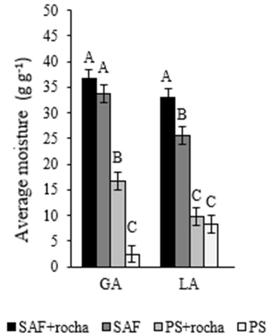 Soil moisture differed between treatments as it was higher in AFSs soils than FS soils, with or without rock powder. In YL, the moisture in AFS+ was higher than in AFS−. In RYA, the moisture in FS+ was higher than in FS−. This demonstrates the effect rock powder has on maintaining moisture in the system (Figure 3).
