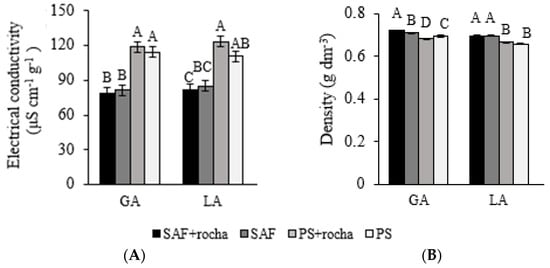 Coffee beans grown on FS presented higher electrical conductivity (Figure 4A) than on AFSs (RYA: 50.3% and YL: 51.1%), demonstrating the effect that agroforestry systems have on coffee quality regardless of whether rock powder is used or not. Bean density differed between treatments (Figure 4B). Coffee beans grown under AFSs had a higher density (38.2% for RYA and 19.4% for YL) when compared to FS+ (Figure 4B).