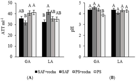 Total titratable acidity (ATT ml−1) (A) and pH (B) of coffee exudates after 24 months of application (+) or non-application (−) of gneiss powder in coffee plantations in agroforestry management (AFSs) or full exposure to the sun (FS) for two agroecological family-owned farming properties (RYA and YL). Means followed by different letters differ statistically from each other by the SNK test (p < 0.05).