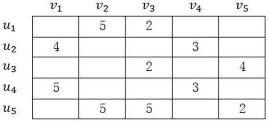 Assuming the recommendation system contains users and items, then the user–item scoring matrix can be defined as . As shown in Figure 1, the represents the scoring of user for item . An empty rating value indicates that the user has not rated the item. In general, many ratings in are empty, so user–item scoring matrix would be a sparse matrix.