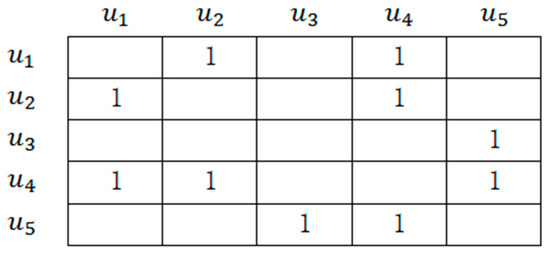 Matrix represents the social relationship between users. As shown in Figure 3, the value of is 0 or 1; 0 means that there is no social relationship between users.