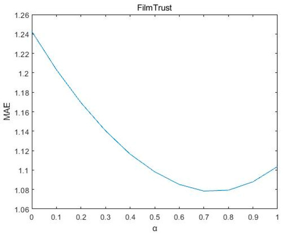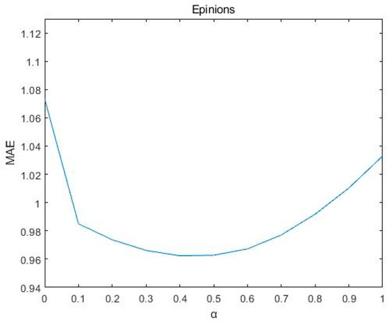 When , only one social relationship is introduced; when takes different values, the MAE value changes in the Epinions and FilmTrust datasets, respectively, are shown in Figure 7 and Figure 8.