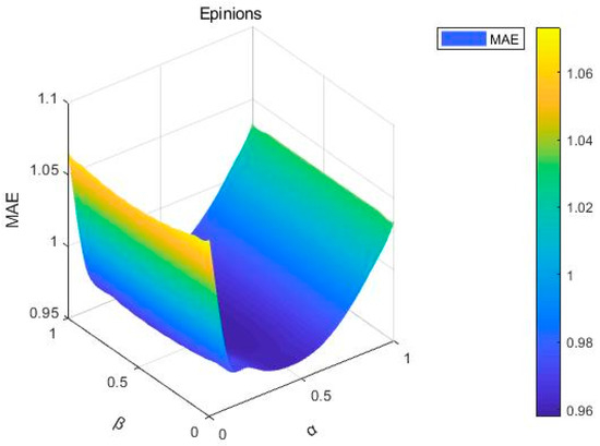 According to the setting rules of parameters in related studies [22,23,24], the dimension of the user feature matrix in all algorithms is k = 5, the number of iterations is 1000, and . Parameter is used to adjust the proportion of the user’s scoring matrix and social relationship matrix, and parameter is used to adjust the proportion of different user relationships. The values of and are different, and the recommended results are also different. The values of and are determined by simulation experiments.