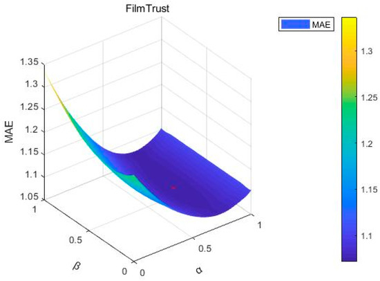 It is assumed that relationship meets the condition, so relationship will be introduced in a matrix factorization algorithm. When and take different values, the MAE value changes in the Epinions and FilmTrust datasets are shown in Figure 9 and Figure 10, respectively.
