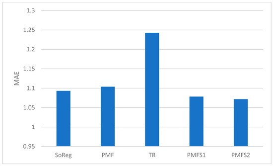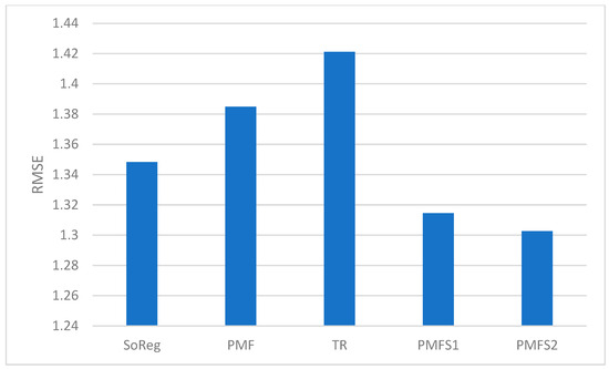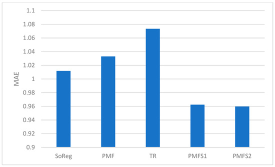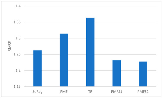 As shown in Figure 11, Figure 12, Figure 13 and Figure 14, the TR algorithm has the highest MAE value and RMSE value. This means that the accuracy of the TR algorithm is the lowest. The recommendation results based only on the user’s relationships are not accurate. The PMFS2 algorithm has the lowest MAE value and RMSE value. This means that the PMFS2 algorithm that introduces two kinds of social relationships has higher accuracy than the traditional matrix factorization algorithm and the PMFS1 algorithm, which only introduces one kind of social relationship. This indicates that the introduction of multiple relationships between users could obviously improve the predicted accuracy; and the more relationships between users, the higher the recommendation accuracy.