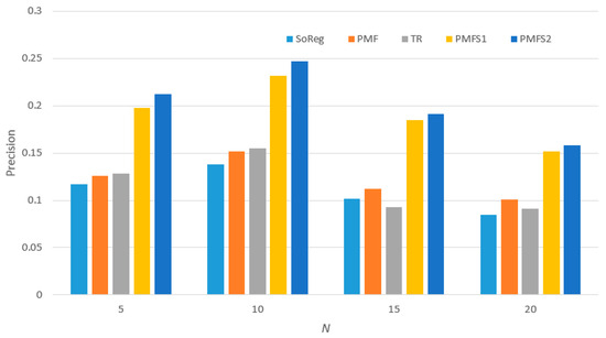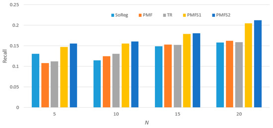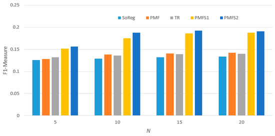 In Figure 15, Figure 16 and Figure 17, we can see that the proposed PMFS1 and PMFS2 models are better than other compared algorithms in terms of precision, recall, and F1-Measure under different numbers of recommendations. And when the number of recommendations is approximately 10–15, the accuracy of recommendations is the highest.