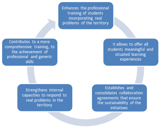 27] in the relationship between universities and companies. In this sense, knowledge acquisition was obtained by transferring the classroom into practice by incorporating experiences in students, generating opportunities for actively acquiring learning in a real context. On the other hand, in studies carried out by other authors on engineering students, another advantage was pointed out, which was related to the fact that engineering students increased their environmental awareness by taking subjects with educational content [