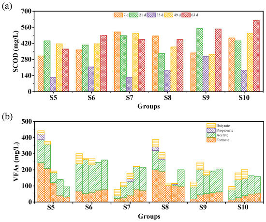 The variations in soluble organics, including SCOD (a) and VFAs (b), in experimental groups.