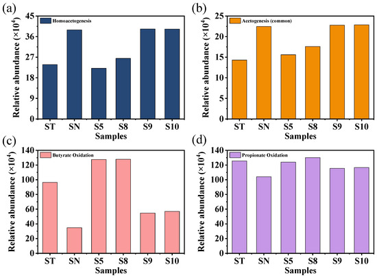The anaerobic digestion process can be divided into four stages: hydrolysis, acidogenesis, acetogenesis, and methanogenesis. Among them, the acetogenesis stage is shown in Figure 2; the acetogenesis pathways mainly include homoacetogenesis (HOM), syntrophic butyrate oxidation (SBO), and syntrophic propionate oxidation (SPO) [40]. From Figure 2a, it can be seen that both bioaugmentation and biostimulation strategies favor HOM. The relative abundance of enzymes of the HOM in S9 with the addition of anaerobic activated sludge was 1.78 times higher than that in S5. The addition of biochar also stimulated the HOM with a 19.51% increase in the relative abundance of functional enzymes. Figure 2b shows the relative abundance of enzymes common to these three pathways, and their abundance variations follow a similar pattern to that of HOM. In the VFAs of each experimental system, the concentration of propionate was low, and the abundance of enzymes related to SPO did not differ much. In SBO, on the other hand, the addition of biochar did not cause changes in the abundance of functional enzymes, but rather, the introduction of anaerobic activated sludge weakened the syntrophic butyrate oxidation pathway.
