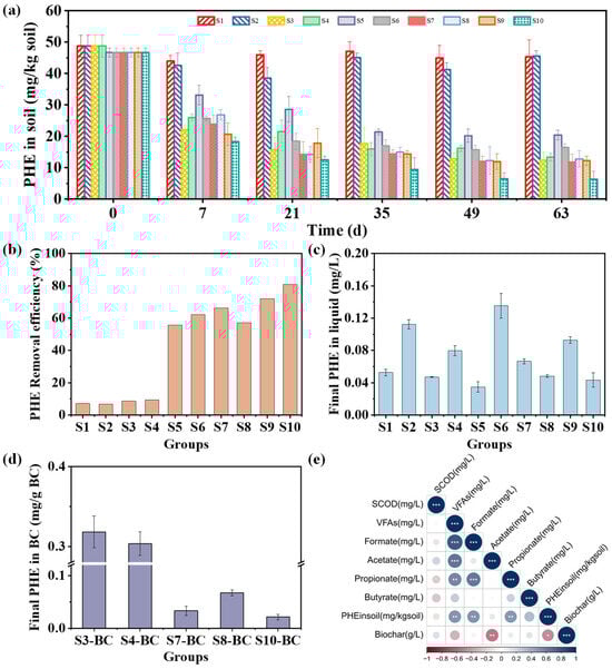 The changes in PHE concentration in soil (a) and the removal of PHE (b), the PHE concentrations in liquids and biochar (c,d), and the heatmap of correlations in performance indicators (e).