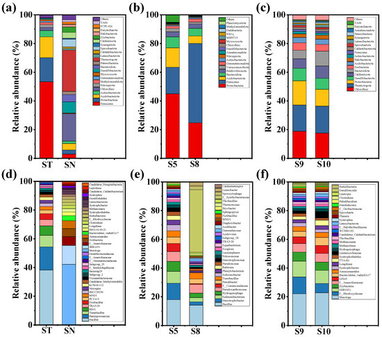 The effects of biochar and anaerobic sludge on microbial community in batch experiments. (Microbial community structure at the phylum level of ST and SN (a), microbial community structure at the phylum level of S5 and S8 (b), microbial community structure at the phylum level of S9 and S10 (c). Microbial community structure at the genus level of ST and SN (d), microbial community structure at the genus level of S5 and S8 (e), microbial community structure at the genus level of S9 and S10 (f)).