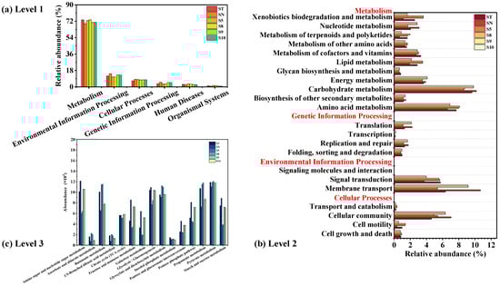 In order to further investigate the effects of adding biochar and anaerobic activated sludge on soil microbial metabolic pathways, the potential functions of microbial communities were predicted and analyzed in conjunction with the KEGG database, and the results are shown in Figure 5. Six functional subgroups were included at level 1, which in order of abundance were metabolism (69.19–73.55%), environmental information processing (10.93–14.40%), cellular processes (6.71–8.28%), genetic information processing (3.18–5.09%), human diseases (2.33–3.51%), and organismal systems (0.69–1.56%). At level 1, metabolism was the highest abundance in all samples, and at level 2, it can be seen that metabolism was refined into 11 pathways, with carbohydrate metabolism, amino acid metabolism, and energy metabolism being the main three pathways. In Figure 5b, it can be seen that the addition or absence of biochar had little effect on the metabolism pathway; rather, the addition of anaerobic sludge played an important role. The carbohydrate metabolism abundance in the experimental group with the addition of anaerobic sludge was relatively high, increasing from 8.60% in S5 to 9.82% in S9 and from 8.71% in S8 to 9.82% in S10. Meanwhile, the addition of anaerobic sludge also increased the abundance of energy metabolism, suggesting that the introduction of the anaerobic sludge microbial community stimulated the metabolism of the carbon source in the system and also facilitated the energy conversion and transfer capacity [54]. However, the abundance of genes in the functions of amino acid metabolism, lipid metabolism, and xenobiotics biodegradation and metabolism showed a trend of decreasing in the experimental group with biostimulation. The cellular processes pathway showed that cellular community function was enhanced, but cell motility function was weakened after the addition of anaerobic sludge. At level 3, it can be seen that anaerobic sludge addition mainly enhances glycolysis/gluconeogenesis in carbohydrate metabolism, amino sugar and nucleotide sugar metabolism, starch, and sucrose. The anaerobic sludge itself can also provide an organic carbon source with a high SCOD detected (Figure 1a). Moreover, it could also stimulate the expression of corresponding genes and enhance the metabolism of the microbial community, making the PHE-contaminated system more stable and further promoting the degradation and utilization of pollutants (Figure 5c).