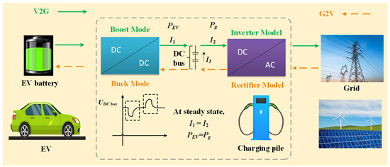 For fast charging scenarios, conventional bidirectional chargers commonly adopt a dual-stage configuration involving DC–DC and DC–AC, as depicted in Figure 2. According to the specific mode of either V2G or G2V, the DC–DC converter operates in buck or boost mode, and the DC–AC converter operates in rectifier or inverter mode [21] This conventional configuration of the bidirectional charger can give good results for V2G and grid-to-vehicle (G2V), but at the same time it can only serve a single entity (either the EV or power grid). This is due to the capacitance acting as the DC bus in the conventional charger; the current of capacitance I3 can be expressed by Equation (1). When the converter operates in steady-state, the capacitor voltage remains stable, and I3 is approximated to zero. At this stage, I1 is equal to I2, with their magnitudes and directions remaining the same, where I1 represents the current generated by the EV through the DC–DC converter, and I2 represents the current flowing towards the DC–AC converter. If the losses of DC–DC and DC–AC are ignored, the EV power is equal to the grid power, which can be formulated as PEV = Pg. This indicates that traditional chargers can only execute either EV instructions or grid instructions, without the ability to simultaneously accommodate both. Furthermore, in conventional chargers, it is necessary to have either a DC–DC converter or DC–AC converter to regulate the stability of the bus voltage. Due to the close correlation between the peak shaving and frequency regulation capabilities of the charger and the DC–AC converter, the stability of the bus voltage is typically controlled by the DC–DC converter. This means that the DC–DC converter lacks the additional freedom to control EV instructions. These analyses once again underscore the fact that the EV instructions and grid instructions in conventional chargers cannot be independently controlled; they can only be maintained as identical.