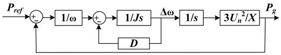 From Equation (19), the dynamic small-signal model of the mechanical equations of the VSG in the S-domain is obtained as shown in Figure 6. In order to simplify the expression, the variable G is introduced as depicted in Equation (20); this leads to the transfer function of active power, as shown in Equation (21).