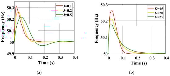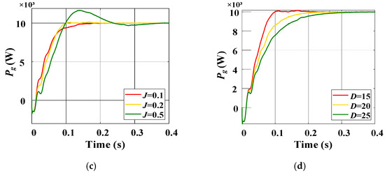 The relationship between the virtual inertia J and damping coefficient D with respect to frequency can be derived from Equation (11), as shown in Equation (26) (apart from their impact on the output power). When is fixed, a larger value of D results in a smaller frequency deviation ∆ω. Moreover, a higher value of J leads to a reduced rate of change in angular velocity. As a result, we can maintain the frequency stability by adjusting the size of J and D. The simulation results are shown in Figure 9 in accordance with the derivation. It can be observed that as J increases, the fluctuation range of frequency becomes smaller. However, the overshoot of active power increases, and the system takes longer to reach a steady state. On the other hand, as D increases, the fluctuation range of frequency also decreases, and the overshoot of active power decreases as well. However, the system’s settling time becomes longer.