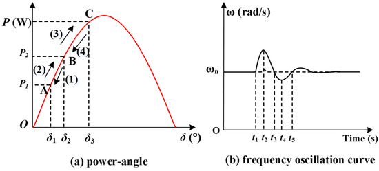 By comparing the effects of J and D on the output power and frequency, we find that it is difficult to balance the speed and stability of the system with fixed parameters [34]. To enhance the control performance of the VSG, the adaptation of VSG parameters can be achieved by considering the characteristics of different stages within the system. The oscillation process of the system can be divided into four stages, as depicted in Figure 10: (1) t1 − t2, (2) t2 − t3, (3) t3 − t4, and (4) t4 − t5. In stage (1), the virtual rotor angular velocity of VSG is greater than the grid angular velocity (ω > ωn), and the rate of change of the angular velocity is positive ( > 0); in stage (3), ω < ωn and < 0. The difference (|ω − ωn|) between the two angular velocities gradually increases, indicating an acceleration phase in the rotor frequency. To suppress the rapid increase of ω, it is necessary to increase J. However, increasing J leads to an increase in σ% and ts. Consequently, D needs to be correspondingly increased to suppress the growth of σ% and ts. These two phases belong to the acceleration phase of the rotor angular frequency, because |ω − ωn| becomes gradually larger and increasing J suppresses the rapid increase in ω but also increases σ% and ts; hence, D is also increased to suppress σ% and ts. Conversely, ω > ωn but < 0 in stage (2) and ω < ωn but > 0 in stage (4); here, |ω − ωn| is gradually becoming smaller, which marks these as the deceleration stages of rotor angle frequency. Reducing J can accelerate ||, facilitating a faster restoration of ω to ωn. Simultaneously, an appropriate increase in D can result in smaller values of σ% and ts. In summary, we can determine whether the rotor is in the acceleration or deceleration stage based on the positive or negative ∆ω () and then adjust J and D to enhance the stability and rapidity of the system.