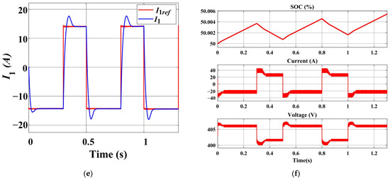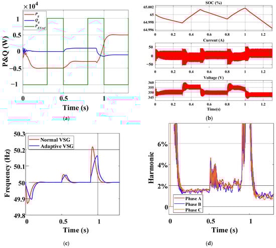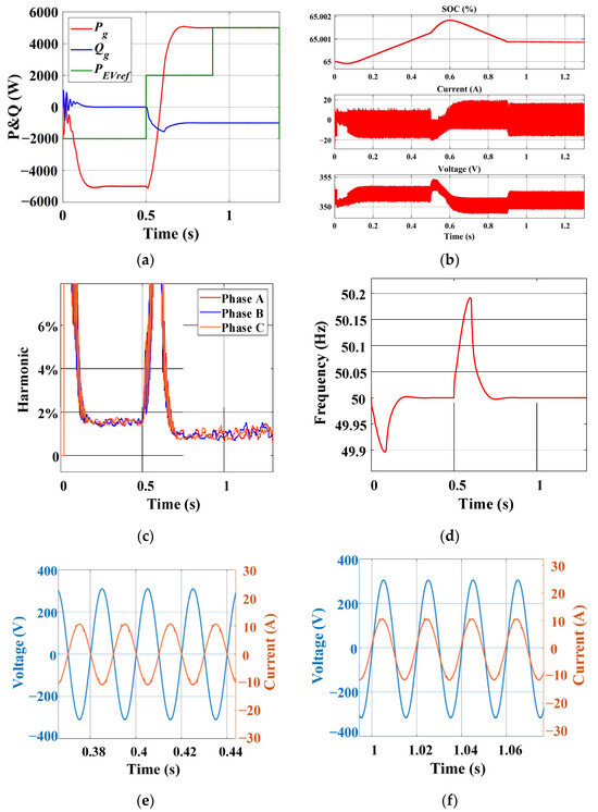 In Figure 11a, when the EV undergoes low-temperature pulse preheating according to the green reference command, both the grid and energy storage system contribute energy to the EV. The high power and repeated switching of the pulses do not impact the grid. When the pulse power and grid power differ in magnitude or direction, stable operation can be maintained. The low stress on the charging pile can enhance power utilization and reduce costs. The low-temperature preheating phase often occurs in the morning or evening, and the residential electricity demand tends to increase due to the use of electrical heating devices under these conditions. During this period, the grid can provide low-power charging to the EV (0.5–0.9 s), or it can also absorb energy from the energy storage system (0.9–1.3 s). Reactive power can be switched positively or negatively, indicating that the charger can also respond to grid peak commands. The adjustment time of Pg is ≤0.2 s and that of Qg is ≤0.15 s. In Figure 11b, due to the vector balance of the EVs, energy storage, and grid, when the power vector difference between EV and grid is larger, the SOC of energy storage changes faster. Figure 11c,d reflect the fact that the frequency and the dynamic harmonic waveform variations are not affected by the EV power variations, which are only related to the grid command. Compared with normal VSG control, adaptive VSG can better suppress the frequency change; when the grid power changes from −3 kW to 5 kW, the frequency fluctuations decrease by 0.05 Hz. Furthermore, the larger the difference between the dispatch instruction and the existing power, the more pronounced the suppression effect on frequency fluctuations, which is consistent with the theoretical analysis. During steady-state operation, the harmonic is satisfied, with a level below 5%. Figure 11e,f show the attainment of a steady state for the EV control variable I1 within 0.1 s. The voltage of the DC bus, which remains unaffected by changes in the EV pulse command and grid command, exhibits minimal fluctuations. As a result, the pulse frequency remains stable, and the regulation time at the battery terminal is further reduced.