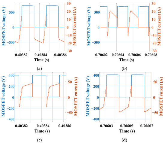 The ZVS of DAB under low-temperature pulse preheating stage: (a) MOSFET on the high-voltage side in EV discharge mode, (b) MOSFET on the high-voltage side in EV charging mode, (c) MOSFET on the low-voltage side in EV discharge mode, and (d) MOSFET on the low-voltage side in EV charging mode.