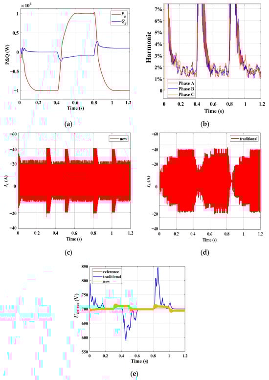 The pulse condition of the traditional charger: (a) the power change of the grid, (b) dynamic harmonic waveform, (c) the inductive current of DAB for the new charger, (d) the inductive current of DAB for the traditional charger, and (e) the voltage of the DC bus.