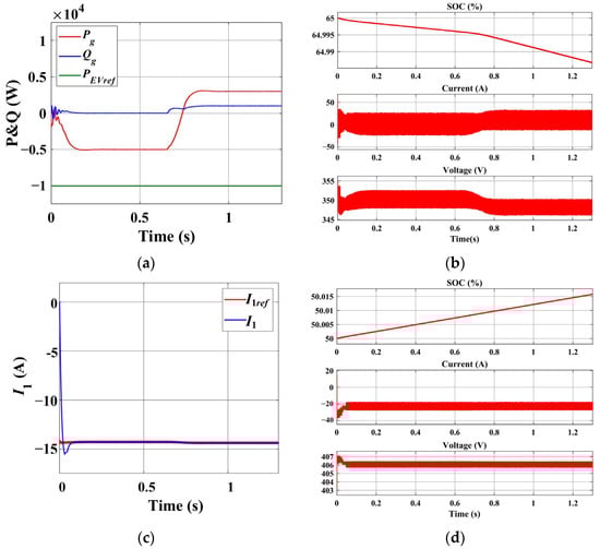 The relevant waveform of charger with initial fast charge stage: (a) the contrast between Pg and Qg and the PEVref, (b) energy storage battery, (c) the reference current and the actual current of EV, and (d) EV battery.