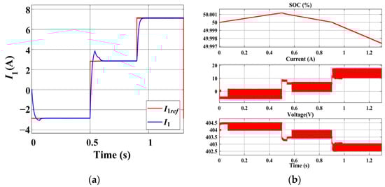 In the initial stage of fast charging, high-power charging rapidly replenishes energy, which can be regarded as a special scenario of pulse charging. If there are no price incentives, the charging of EV fleets tends to be highly concentrated; thus, high-rate charging during the same time period often imposes immense pressure on the grid. However, during the initial stage of fast charging in the new charger, both the grid and energy storage contribute to charging the EV. When the EV is charging at 10 kW, both the grid and the energy storage battery can provide 50% of the energy individually (i.e., 5 kW). The grid power can also be adjusted according to the actual situation, to change the proportion of EV charging power. If the grid load pressure is too high, the grid itself can obtain energy from the energy storage battery while the EV charges normally, as shown in Figure 14a,b. This scheduling ensures flexibility without affecting the execution of other instructions, as depicted in Figure 14c,d, where the control variable I1 and the EV battery current remain stable without being influenced by the grid power scheduling.