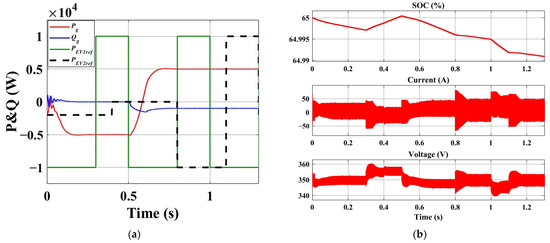 In the later stage of fast charging for EVs, the charging power is reduced (set to 2 kW), and since the energy storage consumes a lot of energy during the early stage of fast charging, the grid (5 kW) simultaneously supplies power to both the EV (2 kW) and the energy storage system. In this way, by considering the characteristics of different stages of the fast charge curve, the energy storage battery as DC bus can receive timely energy supply. Furthermore, as the EV has already been charged to a substantial level, it can cooperate with the energy storage system to respond to grid dispatch (0.5–0.9 s). Alternatively, it can discharge (5 kW) back to the grid (5 kW) to fulfill grid dispatch requirements (0.9–1.3 s). The simulation results are shown in Figure 15.