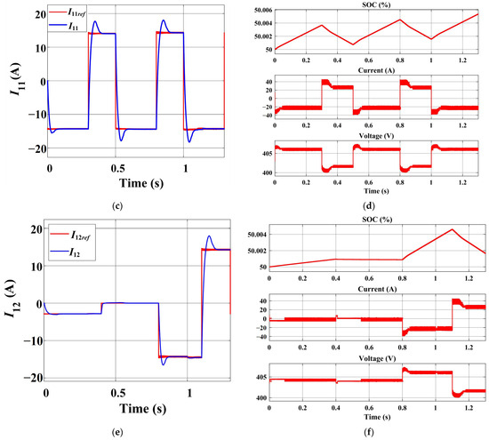 When EVs are connected or disconnected in parallel, the grid dispatch instructions remain unaffected, as depicted by the red and blue curves in Figure 17a. The dashed black and green lines represent instruction variations for the two EVs. The vector balance between the energy storage, EVs, and grid is maintained, as shown in Figure 17b. Figure 17c,d shows the control variables and battery waveforms of EV1. The pulse instruction for EV1 reaches a steady state within 0.1 s, without being influenced by the grid instructions or the parallel connection of EVs. EV2 can be smoothly connected or disconnected, as shown in Figure 17e,f. Notably, during the period 0.4–0.8 s, the reference instruction is zero, but due to DAB circulation, there is still a weak current flow in the battery of EV2, and the SOC is basically unchanged.