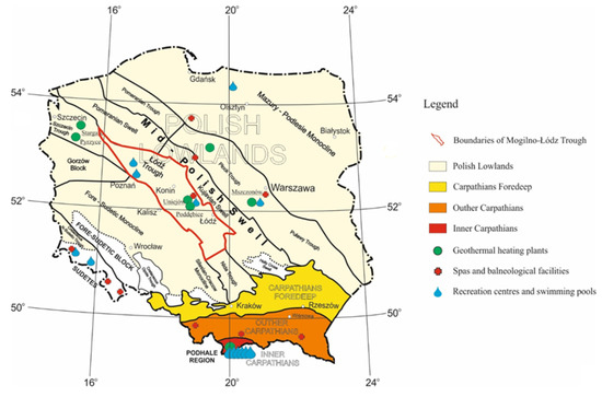 One of the most promising regions in Poland for the use of water resources and geothermal energy is the region located in central Poland within the Mogilno–Łódź Trough (Polish Lowlands). Currently, two of the six geothermal heating plants in Poland are successfully operating within this region (in Uniejów and Poddębice). They are excellent examples of the multifaceted applications of geothermal waters, which range from using geothermal waters for heating purposes, balneotherapy, recreation, and cosmetology to, for example, heating the turf of a football field, or pickling cucumbers based on using geothermal water. Such a vast array of applications, in addition to yielding typically economic benefits, also yields social benefits. These regions have become more attractive, and the use of geothermal waters is seen as a unique selling point for the local area. The indigenous community reaps great benefits, which is reflected in the development of the region and improvements in the quality of the environment resulting from reducing solid fuel combustion.