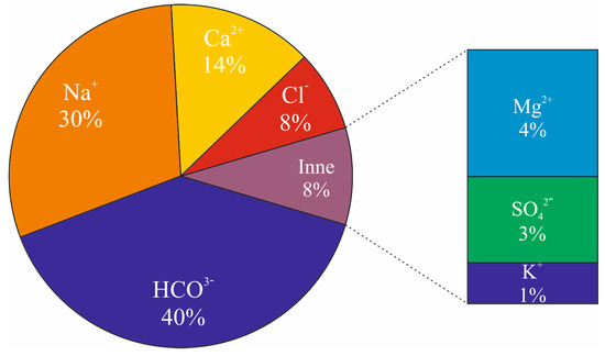 The second heat plant located in the Mogilno–Łódź Trough is the Poddębice heat plant, where geothermal waters were documented in 2010. Currently, geothermal water is used for heating purposes, balneotherapy, recreation and, on a limited scale, also for consumption. An interesting case, from chemical and thermal points of view, is water from the Lower Cretaceous at great depth, which was made available through the Poddębice GT-2 well. A sampled interval is located at depths of 1962–2063 m. The geothermal water at the outflow of the well is characterized by having a temperature of ca. 71 °C and low mineralization of 432 mg/L, which is unusual for waters occurring in the surrounding area at similar depths. The diagram in Figure 4 shows the main water ions in this water. The further expansion of the system for the following years has planned, including the revitalization and development of the existing geothermal complex. Water from the Poddębice GT-2 well is of the Na–Ca–HCO3 type, which distinguishes it from other waters from the area, where waters of the Na–Cl type prevail. Their mineralization ranges from ca. 2–9 to 21–74 g/L, which is much higher than the mineralization of the fresh water from the Poddębice GT-2 well. Moreover, water from the well also contains slight amounts of iron, iodine, and bromine ions [24]. Poddębice, following the example of the heat plant in Uniejów, is trying to leverage the hidden potential of groundwaters as widely as possible [5].