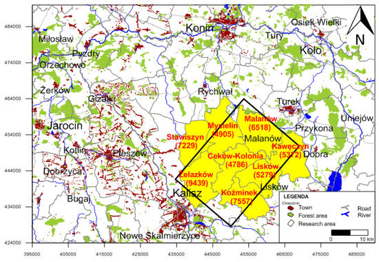 Due to the great potential of the Mogilno–Łódź Trough, based on research and analyses carried out so far [24,25], another area that could be developed in a similar way in the near future is the Malanów region (Figure 5). This area, located in central–western Poland within the Wielkopolskie Voivodeship, is poor in mineral resources, mainly natural aggregates, sand, gravel, and peat, but they are not of significant importance for their economic use. Large tracts of forests and numerous peat bogs, swamps, and meadows have an influence on the landscape and promote the development of tourism. There is no centralized heating network in Malanów and its neighboring communes. The buildings are mostly heated by independent heating installations fueled by coal, fuel oil, or wood. Taking into account the development possibilities of regions using geothermal energy, as is the case of Uniejów or Poddębice, potential investments in the Malanów region could contribute to the development of both the Malanów commune itself and its neighboring communes.