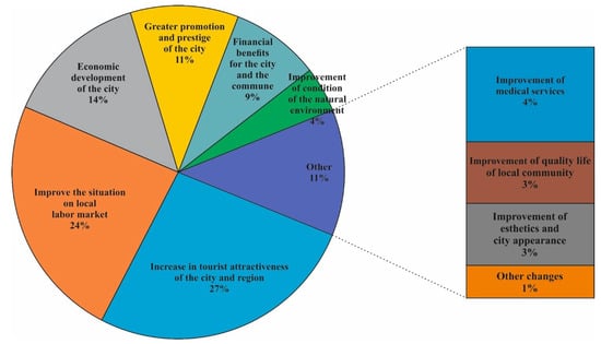 One of the essential elements of achieving success in the use of geothermal waters is the social awareness of the inhabitants of the commune—both policymakers and all citizens and visitors [38,39]. The results of the research conducted by Smętkiewicz [38,39] in the Uniejów health resort, which uses geothermal waters as a natural resource, clearly show that, according to the health resort’s residents and visitors, geothermal energy plays a key role in the favorable socio-economic changes in the town (Figure 7). The use of geothermal waters primarily contributes to increasing the attractiveness of the town and even the entire region to tourists, improving the status of the local labor market and economic development. All these elements generally translate into improving the quality of life of the local community.