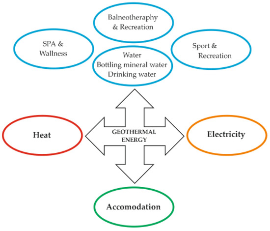 In addition to energy applications that bring significant environmental benefits, geothermal waters can be used for recreation, balneotherapy, and cosmetology. These are the applications that attract tourists or patients to visit a region and enjoy the benefits of geothermal waters. From the point of view of tourism development, the use of geothermal resources has the following main functions [40]: spa and recreation, balneotherapy, heating and electricity generation (if possible, depending on their temperature (Figure 9), chemical composition, and the presence of mud). The development of tourism influences the economic development of a region. Accommodation facilities are being built or modernized, catering services are being developed, and areas for recreation are being created. The quality of life of the inhabitants is improved through the development of urban infrastructure and the emergence of new investments in the city. The energy application of geothermal resources affects air quality, as the amount of pollutants emitted is the result of burning solid fuels, which is currently a huge problem in many towns (and even tourist resorts) across Poland. The results of the research presented in the literature confirm the existence of a number of benefits for the community related to the extensive use of the local geothermal resources [41,42]. The significant socio-economic and tourism development of the region can be observed.