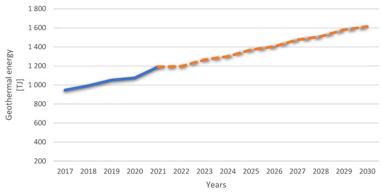 Taking into account the degree of the use of geothermal energy in Uniejów and Poddębice, as well as the possibilities of introducing the use of geothermal energy in regions such as Malanów, it can be assumed that this RES sector will develop in the coming years. If this increase is similar to the increase that took place between 2017 and 2021 (according to data from the Central Statistical Office), we can expect to achieve a level of approximately 1600 TJ geothermal energy in 2030 (Figure 10). This prediction was made assuming that the geothermal energy sector will experience the stable growth observed in the previous years in Poland.