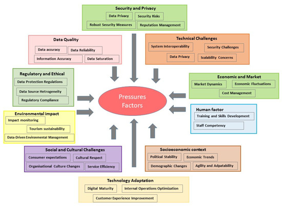 - Economic and market: Market dynamics and associated costs are significant pressures. The tourism market is highly competitive and subject to rapid economic fluctuations. Businesses must balance the costs of data technology and infrastructure with the need to maintain competitive prices and generate profits [120,121].