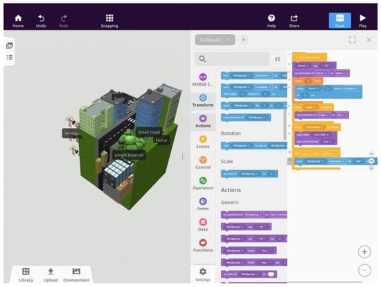 After constructing their ideal city, students were required to use animated text boxes that they had coded using the CoSpaces Edu block-programming feature called “CoBlocks” to explain the reasons behind their sustainable design decisions (Figure 4). The students were required to code a function that keeps their design explanations secret until the user touches the text boxes.