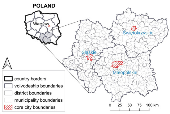 The research area covers three voivodeships in southern Poland, Małopolskie, Świętokrzyskie, and Śląskie (Figure 1).
