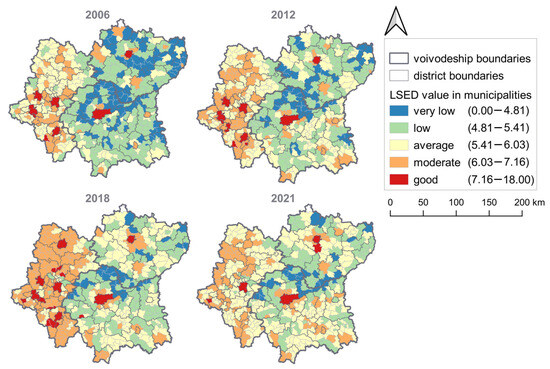 Małopolskie and Świętokrzyskie Voivodeships have two strong urban areas, Kraków and Kielce, respectively. These cities scored relatively higher than Gliwice, which leads the ranking for Silesian Voivodeship (Appendix A Table A1). In our in-depth analysis, Kraków (Małopolskie) reached the highest value of LSED. At the same time, Małopolskie has municipalities with the lowest indicator values (under the present research design). This fact may demonstrate a certain polarisation and division into municipalities with a strong politically and economically well-founded position and municipalities with a lower socioeconomic potential. Our macro-scale analysis of all municipalities revealed that they achieved a total of 2518.36 LSED points by the average LSED from 2006 to 2021, which is about 31% of the maximum score. The highest score was recorded for Śląskie and the lowest for Małopolskie, which may be consistent with the developmental disparities across the latter and the generally accepted discourse on the high socioeconomic development level in Śląskie as a rich region.