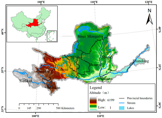 The Yellow River is the second longest river and plays an important role in the ecosystem cycle in China. The landform in the region includes the Qinghai Tibet Plateau, the Inner Mongolian Plateau, the Loess Plateau, and the Huang Huai Hai Plain. The average altitude in the western region is over 4000 m, and the landforms are mostly high-altitude forests. The elevation of the central region is mostly between 1000 and 2000 m, with mostly forested and grassland landforms. However, soil erosion has been relatively severe throughout the year. The eastern region has a lower altitude and is mostly characterized by alluvial plains. The YRB belongs to a temperate monsoon climate, with significant seasonal climate changes and significant spatial differences (see Figure 1). It is an important ecological regulation system in China. In recent years, China has taken a series of environmental measures that have improved the ecosystem of the YRB [42,46,63]. Therefore, conducting a long-term assessment of the ecosystem in the YRB is extremely important. Based on this, this article focuses on exploring the spatiotemporal evolution characteristics and influencing factors of NPP in the YRB from 2000 to 2020.