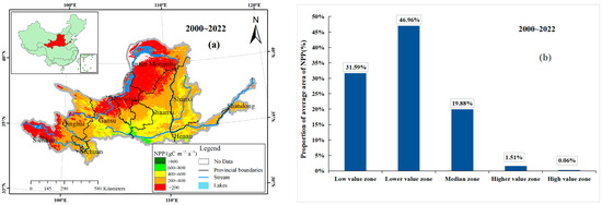 Spatial Distribution of Vegetation NPP in YRB from 2000 to 2022 (NPP divided into five categories based on numerical values). (a) shows the spatial distribution of different NPP levels in YRB; (b) right side shows the area proportion of different NPP levels in YRB.