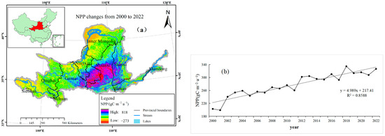 Spatiotemporal changes in vegetation NPP in YRB from 2000 to 2022 ((a) shows the spatial changes, (b) shows the temporal changes).