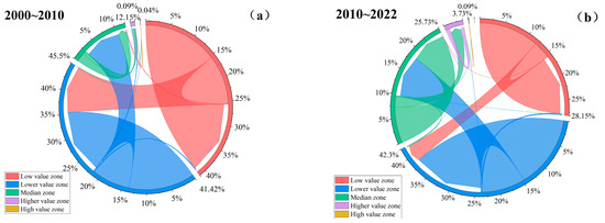 Chord chart (area proportion) of vegetation NPP level conversion in different periods of YRB ((a) 2000–2010; (b) 2010–2022).