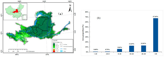 Analysis results of NPP change rate of vegetation in YRB ((a) spatial distribution of NPP change rate of vegetation in YRB; (b) statistical chart of NPP change rate of vegetation in YRB).