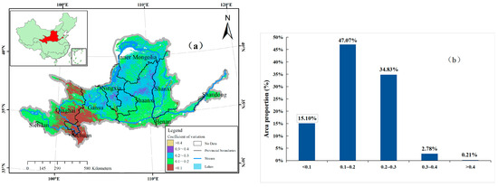 NPP stability analysis results of vegetation in YRB ((a) spatial distribution of NPP variation coefficient of vegetation in YRB; (b) statistical chart of NPP variation coefficient of vegetation in YRB).