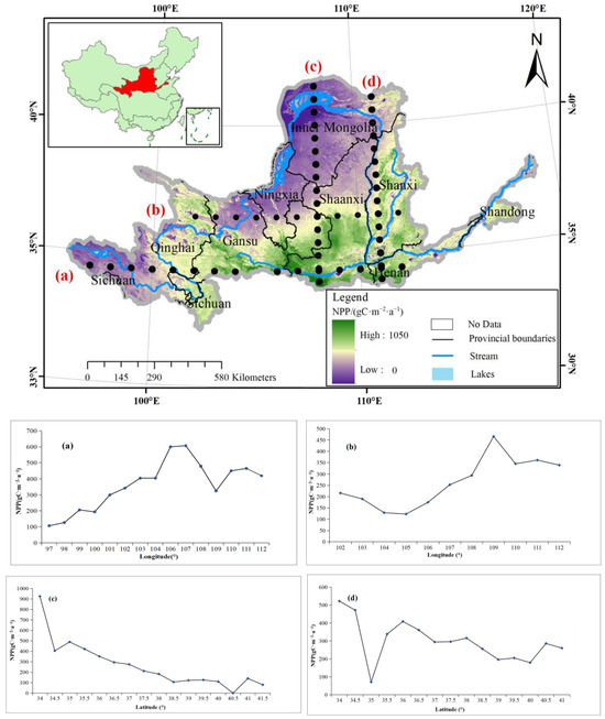 In recent years, many scholars have studied the changes in the NPP in the YRB. Zhang et al. [41] used MODIS NPP data products, along with a quantitative net ecosystem productivity (NEP) estimation model, and systematically analyzed the ecological changes in this region. Jiang et al. [42], using remote sensing data, MODIS NPP, and meteorological data, studied the spatiotemporal transformation of NPP and Precipitation Use Efficiency (PUE). Yang and Li [43] used fossil fuel carbon emission grid data and land use data and studied the spatiotemporal heterogeneity and driving mechanisms of the Yellow River Delta. Zhang and Liu [44] conducted studies on the spatiotemporal variation characteristics of five urban agglomerations using spatial expansion measurements, centroid shifts, urban primacy, and gravity models. Liu et al. [45] constructed ecological restoration evaluation indicators, systematically analyzed the impact of climate and human activities on the environment, and comprehensively evaluated the ecological restoration status and potential of the upper reaches of the Yellow River. Tian et al. [46] used various analysis methods to study the spatiotemporal variation characteristics of NPP in the YRB over the past 40 years and quantified the impact of meteorological factors on it. Zhang et al. [47] quantitatively assessed the relationship between changes in NPP and human activities and climate in the high-altitude grasslands from 2000 to 2020. Xue et al. [48] analyzed the spatiotemporal variation characteristics of NPP in the upstream region using the random forest method. Wei et al. [49] studied the spatiotemporal variation of NPP based on adjusted ecological parameter factors. Song et al. [50] assessed NPP changes in the Sanjiangyuan area from 2000 to 2019 using the Carnegie–Ames–Stanford Approach (CASA) model. Xuan and Rao [51] studied the spatiotemporal variation characteristics and influencing factors of NPP in the midstream region from 2000 to 2020. Chen et al. [52] studied variations in NPP in parts of the Loess Plateau. Zhu et al. [53] combined RS and GIS methods to analyze the ecological changes in the YRB. Hong et al. [54] studied the temporal and spatial variation of vegetation NPP and its driving factors in Ningxia.