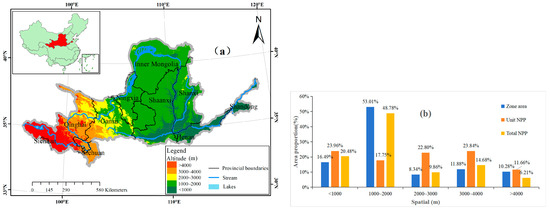 Statistical map of elevation divisions and vegetation NPP in YRB ((a) spatial distribution map of divisions according to altitude in YRB; (b) the proportion of NPP area divided by altitude in YRB).