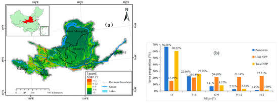 The terrain of the YRB is complex. In order to study the impact of terrain on vegetation NPP, we use slope as an indicator and divide the slope into five levels on average based on the magnitude of the slope values in the region. We then analyzed the NPP values corresponding to these different slope categories, as shown in Figure 10 and Table 4. The results reveal that the majority of the YRB’s regions have slopes of 6° or less (88.74%), covering almost the entire basin except for mountainous areas in the western and southern regions. A general trend is observed when considering unit NPP (NPP per unit area), where higher slopes are associated with higher unit NPP. But, due to the distribution of slope categories in the YRB, the total vegetation NPP is primarily concentrated in areas with lower slopes (<6°), accounting for 86.18% of the total NPP.